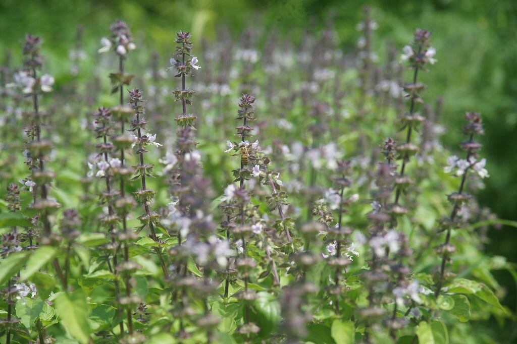 トゥルシの花の蜜は、日本蜜蜂も大好きです。